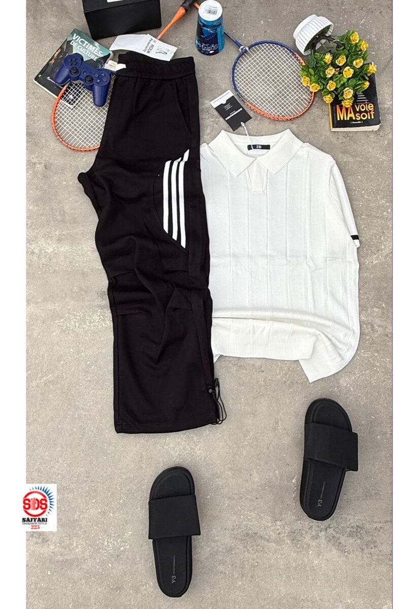 Adoptez un style moderne et confortable avec cet ensemble décontracté noir et blanc. Comprend un t-shirt blanc léger et un pantalon noir avec bandes. Idéal pour les sorties décontractées ou les jours de détente à la maison. Associez-le avec des sandales pour une touche finale élégante. Ce choix pratique est parfait pour l'homme actif qui apprécie le confort et le style.