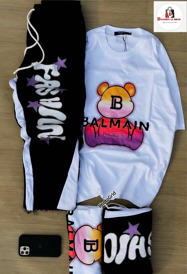 Découvrez ce magnifique ensemble décontracté composé d'un t-shirt et d'un pantalon avec un imprimé amusant Balmain. Confortable et stylé, idéal pour une journée relaxante. Parfait pour afficher votre sens unique de la mode!