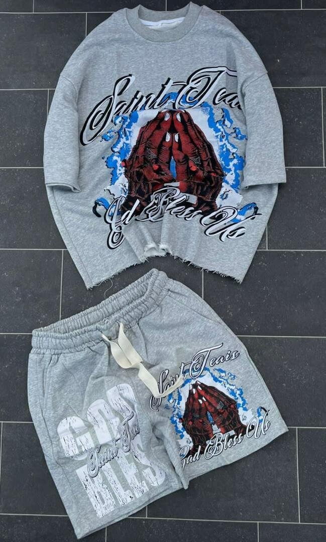 Ensemble streetwear pour hommes avec motifs tendance. Comprend un t-shirt ample et un short confortable, idéal pour un look urbain. Parfait pour les sorties casual ou activités décontractées. Tissu léger et respirant.