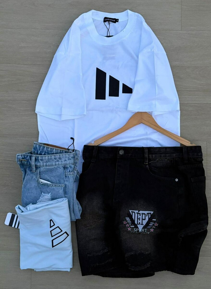Optez pour cet ensemble moderne et stylé avec un t-shirt blanc graphique et un short en denim noir. Idéal pour une tenue décontractée et tendance.