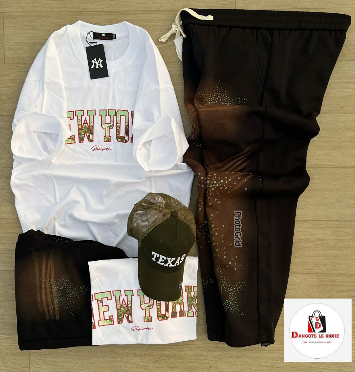 Adoptez un style urbain chic avec cet ensemble décontracté. Composé d'un t-shirt à imprimé New York, d'un pantalon confortable et d'une casquette Texas, c'est le choix idéal pour une allure moderne et sportive.