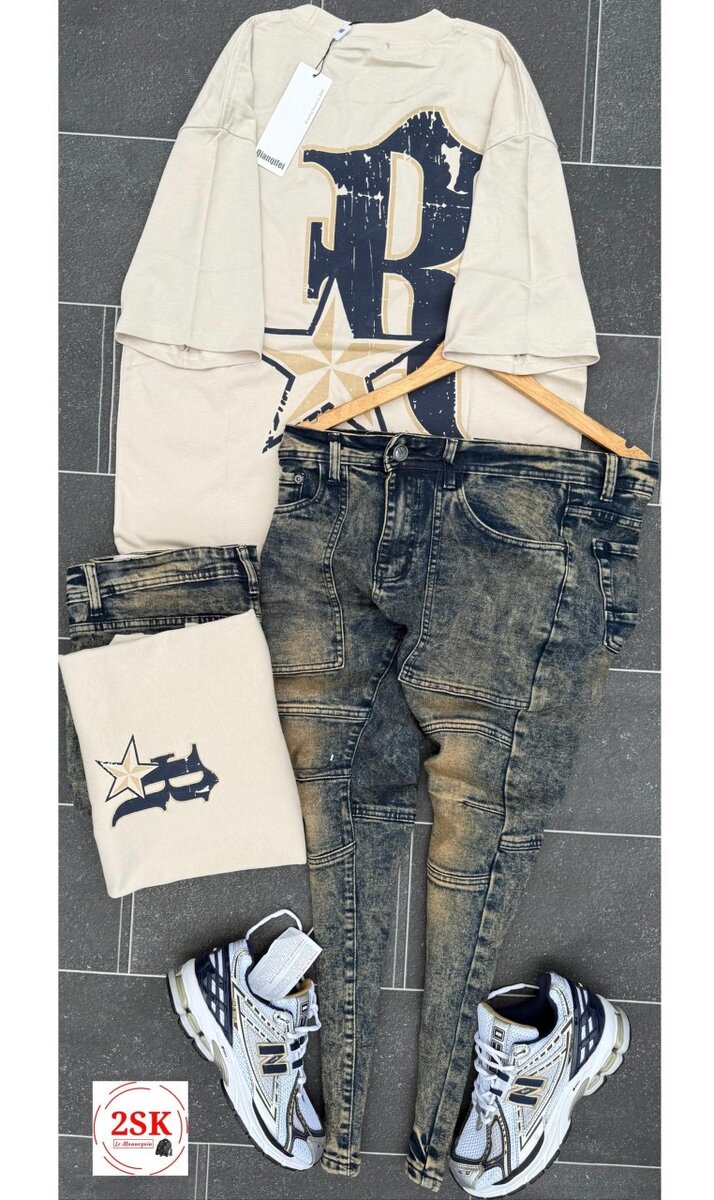 Ce look urbain pour hommes comprend un t-shirt imprimé et un jean stylé, idéal pour les sorties décontractées et les rencontres entre amis. Associez-les avec des baskets pour un confort optimal et un style assuré. Conçu pour allier mode et confort, cet ensemble est parfait pour un usage quotidien.