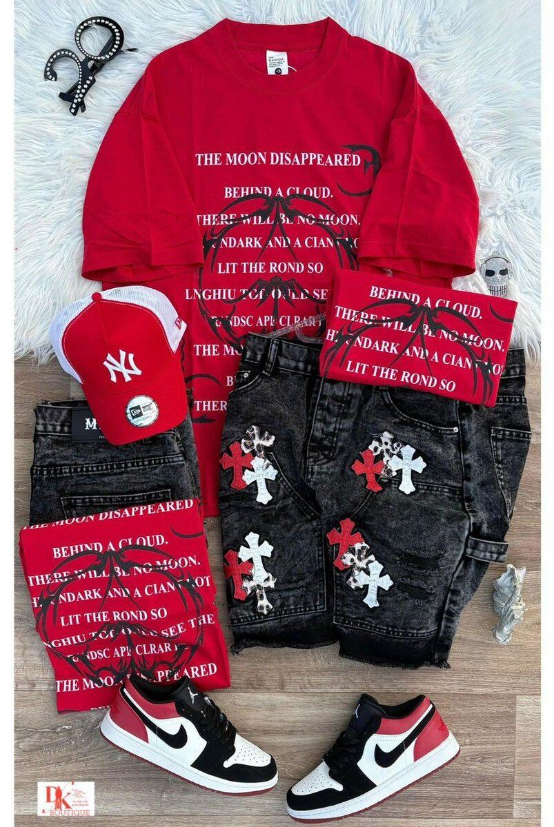 Cet ensemble audacieux et tendance comprend un t-shirt rouge avec inscription, un short en jean noir orné de patchs, une casquette rouge et des baskets assorties. Parfait pour un look urbain et stylé.