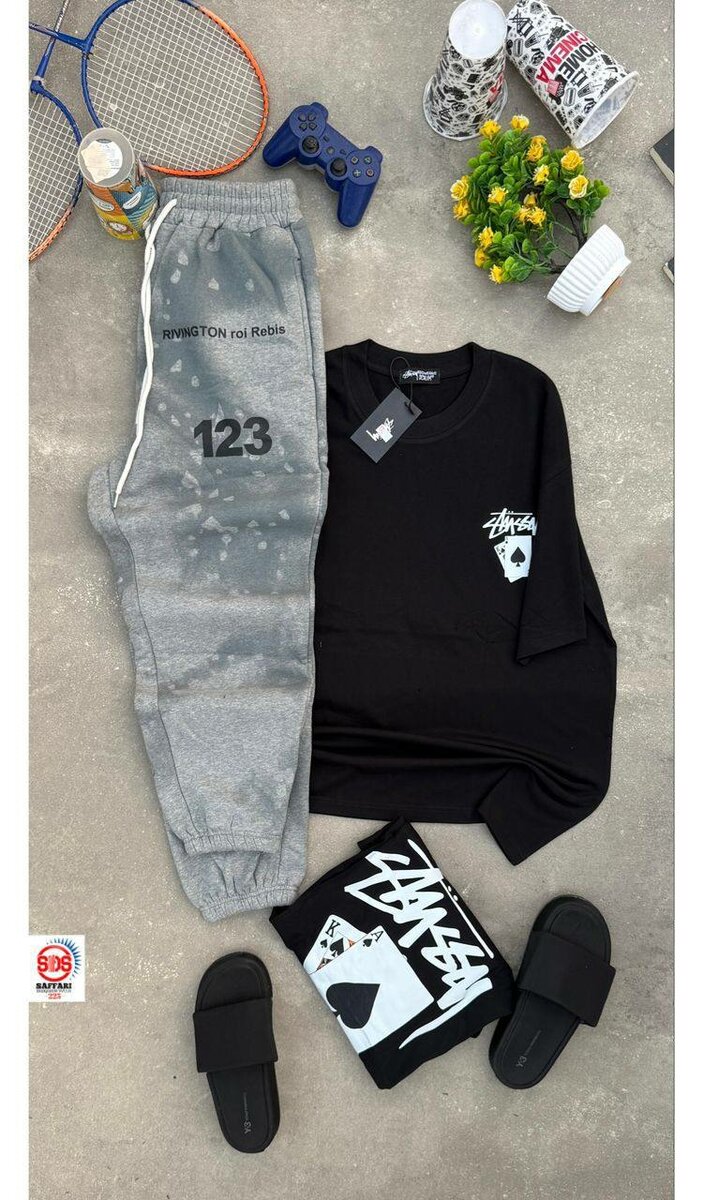 Découvrez cet ensemble décontracté de Stussy, idéal pour vos journées détente. Le t-shirt noir à motif tendance s'associe parfaitement avec le pantalon gris confortable. Parfait pour un style urbain et relax. Complétez le look avec les sandales incluses. Idéal pour un weekend chill ou une sortie décontractée entre amis. Confort et style assurés avec Stussy.