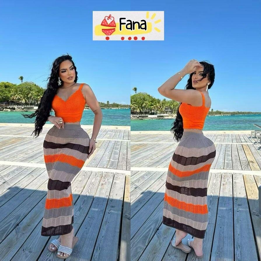 Cet ensemble en maille orange et marron est idéal pour une journée ensoleillée au bord de l'eau. Conçu pour le confort et le style, il se compose d'un haut élégant et d'une jupe longue. Parfait pour des vacances ou une sortie décontractée. Faites-vous remarquer avec ce look vibrant et sophistiqué. Taille unique et extensible pour convenir à toutes.