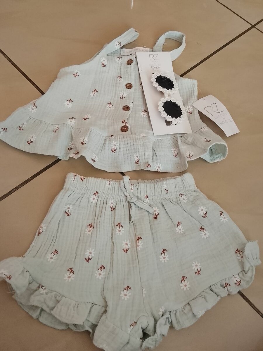Adorable ensemble d'été pour fille, comprenant un haut à boutons et un short assorti avec un motif floral. Fabriqué en tissu léger et respirant, parfait pour les journées chaudes. Complété par des accessoires ravissants. Idéal pour les sorties estivales ou les vacances.