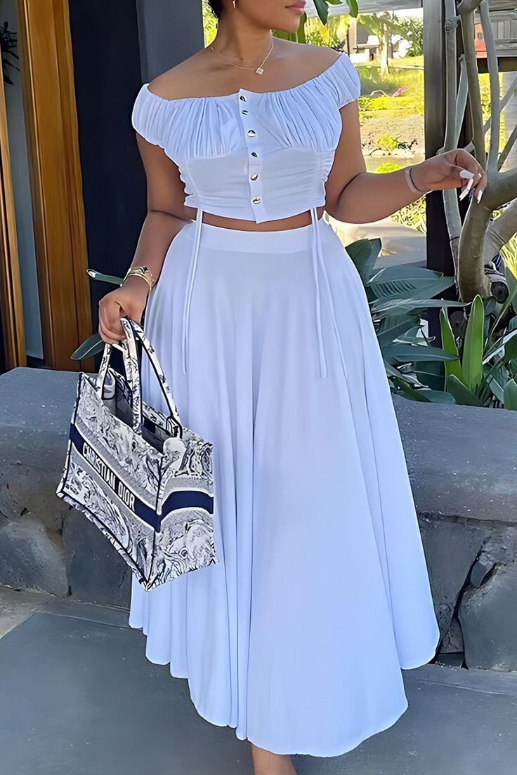 Découvrez cet ensemble deux pièces élégant et confortable, parfait pour les occasions décontractées ou les sorties. Conçu dans des tons pastel, il comprend un haut à épaules dénudées et une jupe longue fluide.