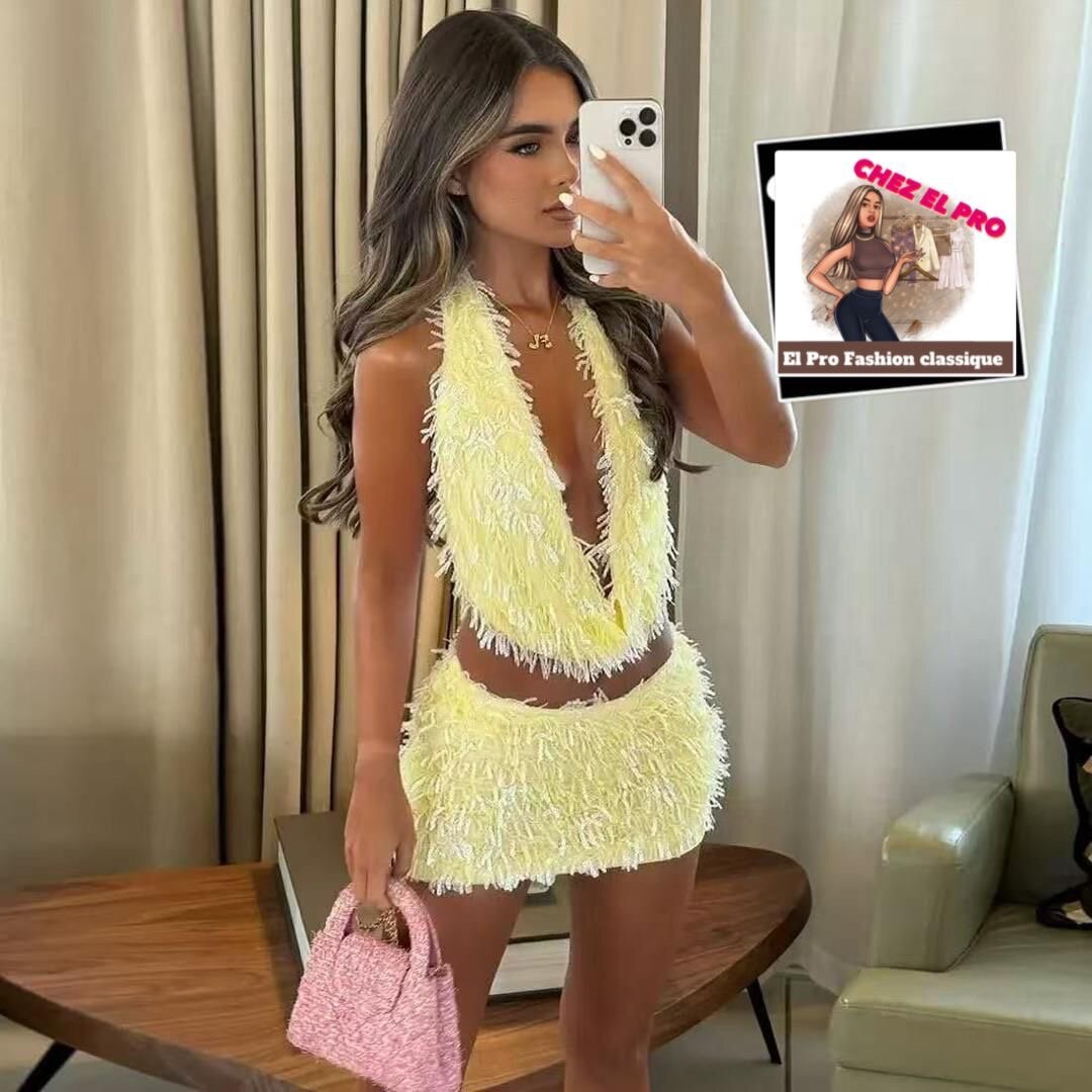 Cet ensemble deux pièces chic donne une allure mode et audacieuse. Idéal pour les soirées estivales ou les événements spéciaux, il allie confort et style. Sa coupe flatteuse et sa matière douce le rendent parfait pour les fashionistas.