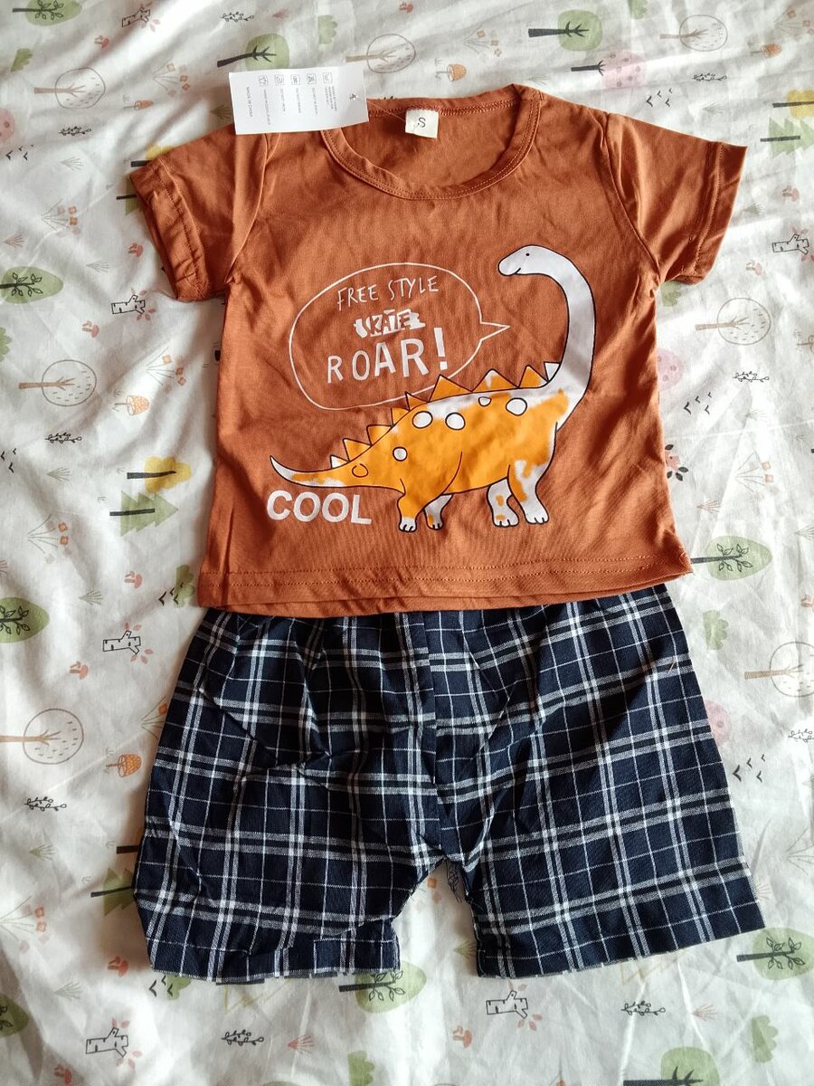 Adorable ensemble t-shirt à motif dinosaure et short à carreaux pour enfants. Idéal pour l'été, fabriqué en coton doux pour un confort optimal. Parfait pour les petits aventuriers !