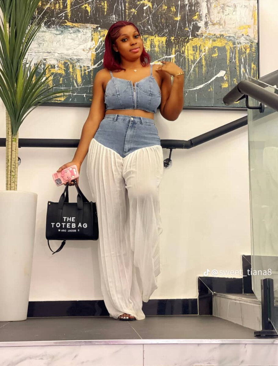 Découvrez cet ensemble chic composé d'un top en denim ajusté et d'un pantalon large en voile blanc transparent. Parfait pour une sortie estivale ou une journée décontractée, ce look allie confort et style. Associez-le à votre sac à main préféré pour un effet tendance assuré.