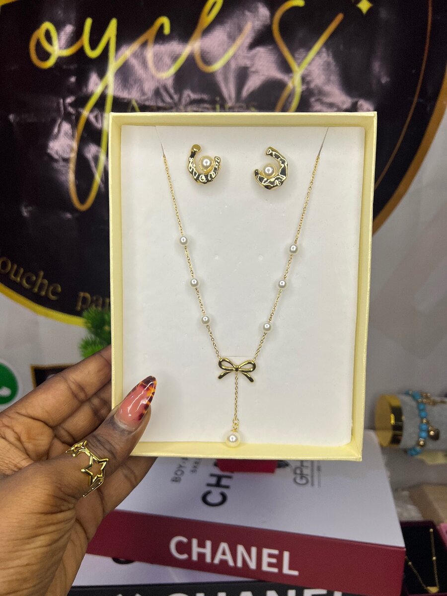 Bijou raffiné avec collier et boucles d'oreilles assorties, parfait pour ajouter une touche de sophistication à toute tenue. Chaque pièce est délicatement ornée de perles et de pendentifs en forme de cœur ou de nœud pour une allure élégante. Idéal pour les occasions spéciales ou comme cadeau chic.