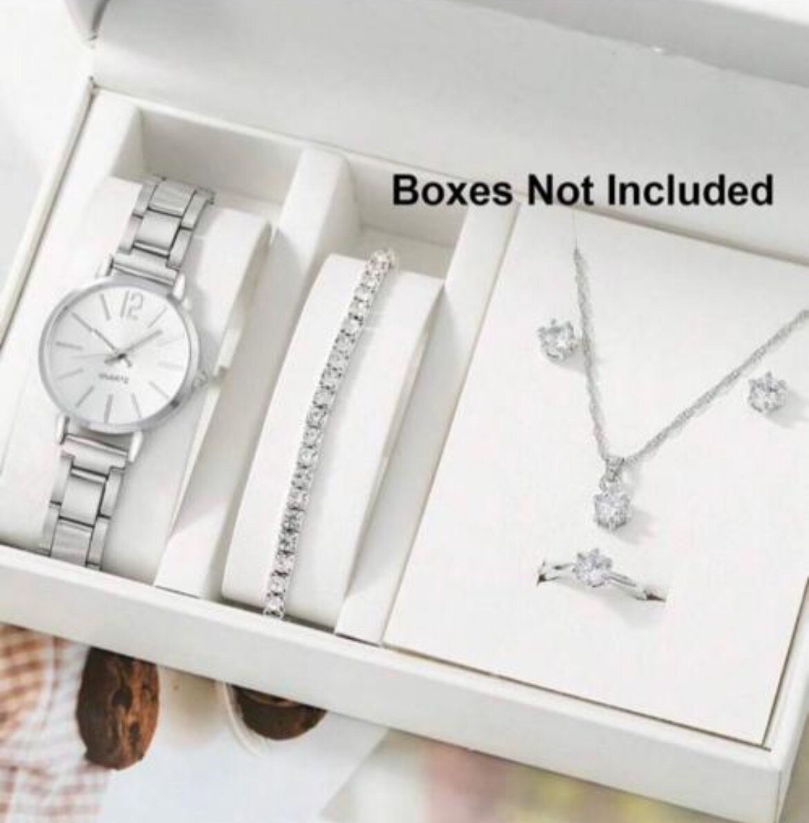 Découvrez notre ensemble d'élégance, parfait pour toutes les occasions. Comprend une montre raffinée, un bracelet brillant, un collier délicat, des boucles d'oreilles étincelantes et une bague élégante. Un choix idéal pour rehausser votre style quotidien ou pour offrir en cadeau.