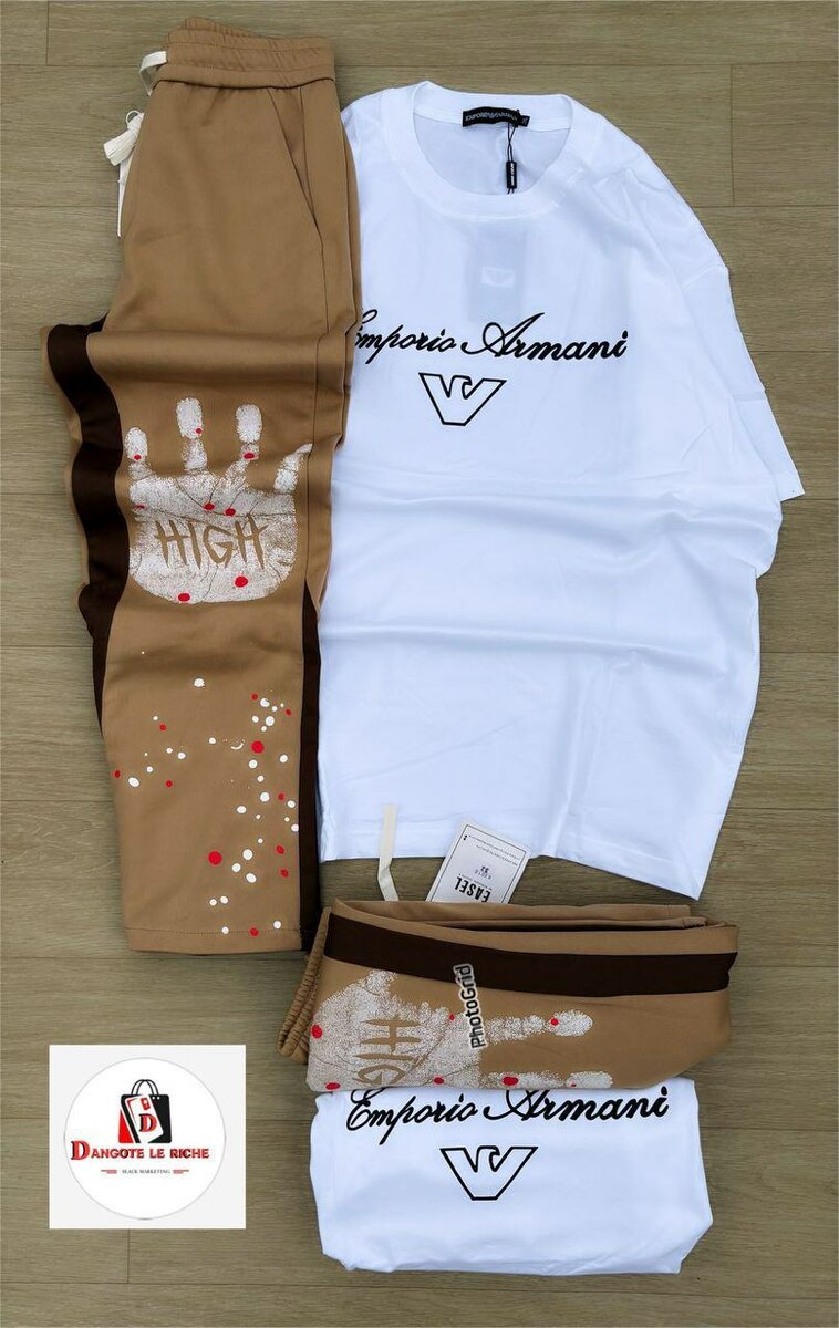 Ensemble Emporio Armani pour un style décontracté et élégant. Comprend un t-shirt blanc et un pantalon beige avec détails artistiques. Confort et tendance assurés. Parfait pour une tenue quotidienne ou de loisirs. Chic et unique, idéal pour les passionnés de mode.