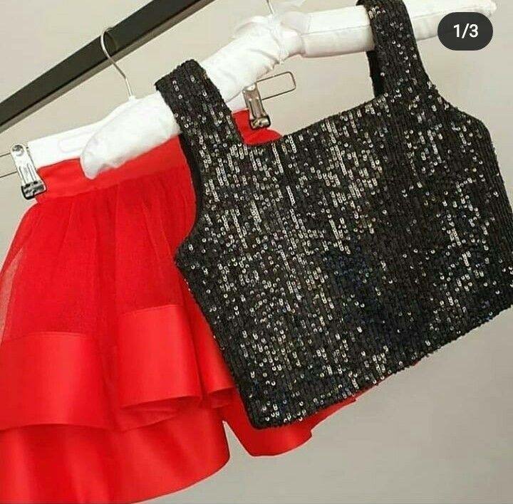 Éclatant ensemble pour fille, comprenant un top à paillettes et une jupe rouge. Parfait pour les occasions spéciales, ce duo chic et élégant mettra en valeur votre enfant. Idéal pour les fêtes et célébrations.