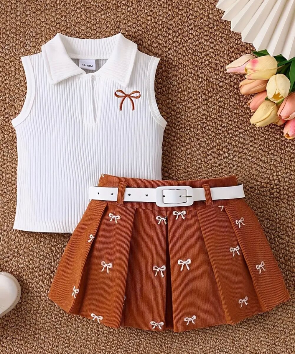 Magnifique ensemble enfant comprenant un haut sans manches blanc et une jupe plissée brune. Idéal pour les occasions spéciales, cet ensemble allie confort et style avec ses détails délicats. Parfait pour les saisons chaudes!