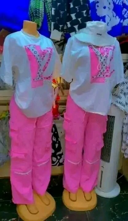 Ensemble enfant garçon composé d'un haut blanc à motifs et d'un pantalon cargo rose vif. Idéal pour les activités quotidiennes. Conçu pour le confort et le style.