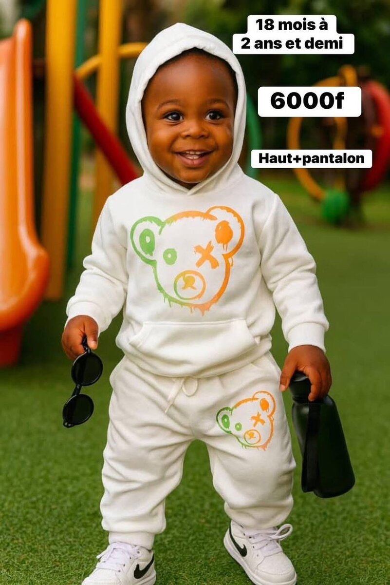 Adorable ensemble en coton pour enfants âgés de 18 mois à 2 ans et demi. Comprend un haut à capuche et un pantalon avec motif ourson. Parfait pour les sorties ou les jeux en plein air, offrant confort et style.