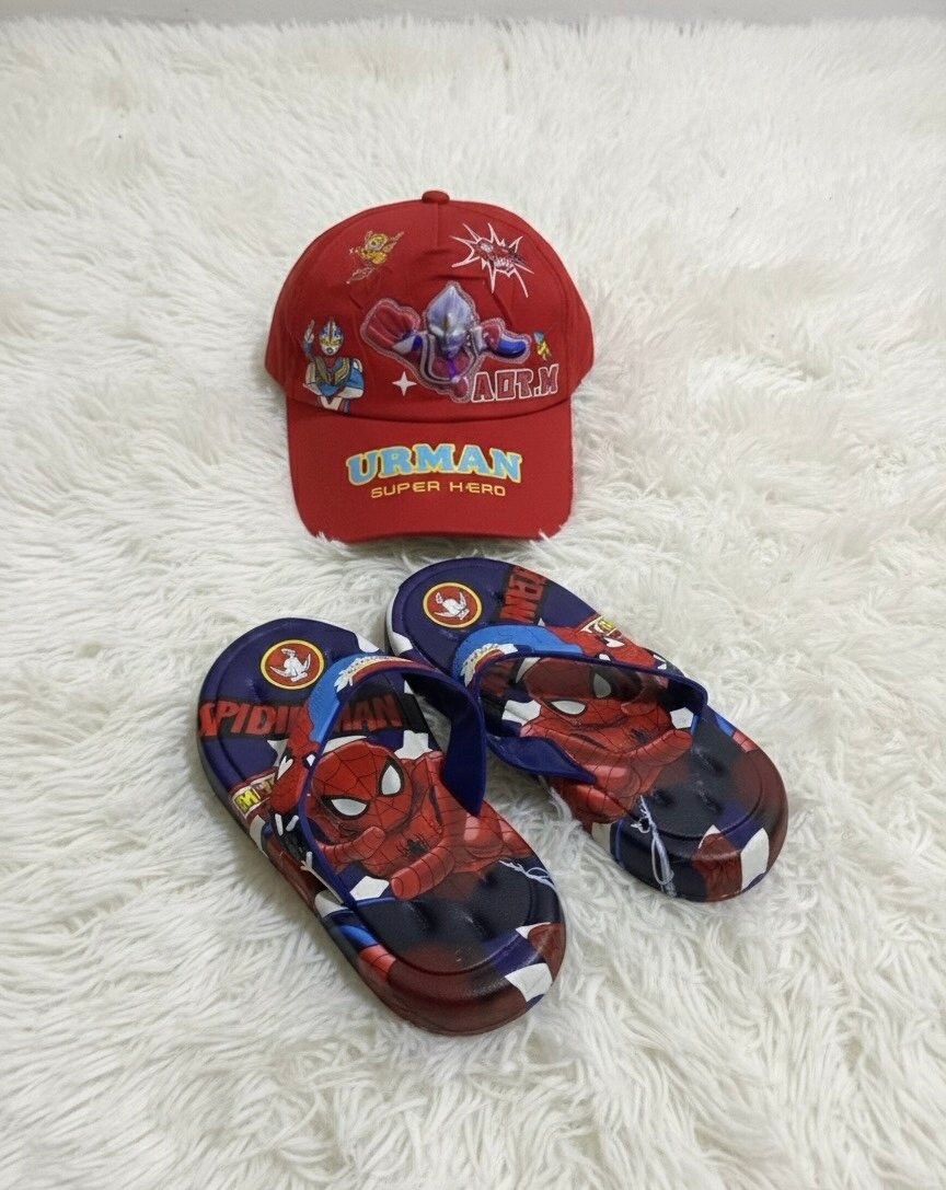 Casquette et sandales super-héros colorées pour enfants. Idéales pour des aventures estivales.