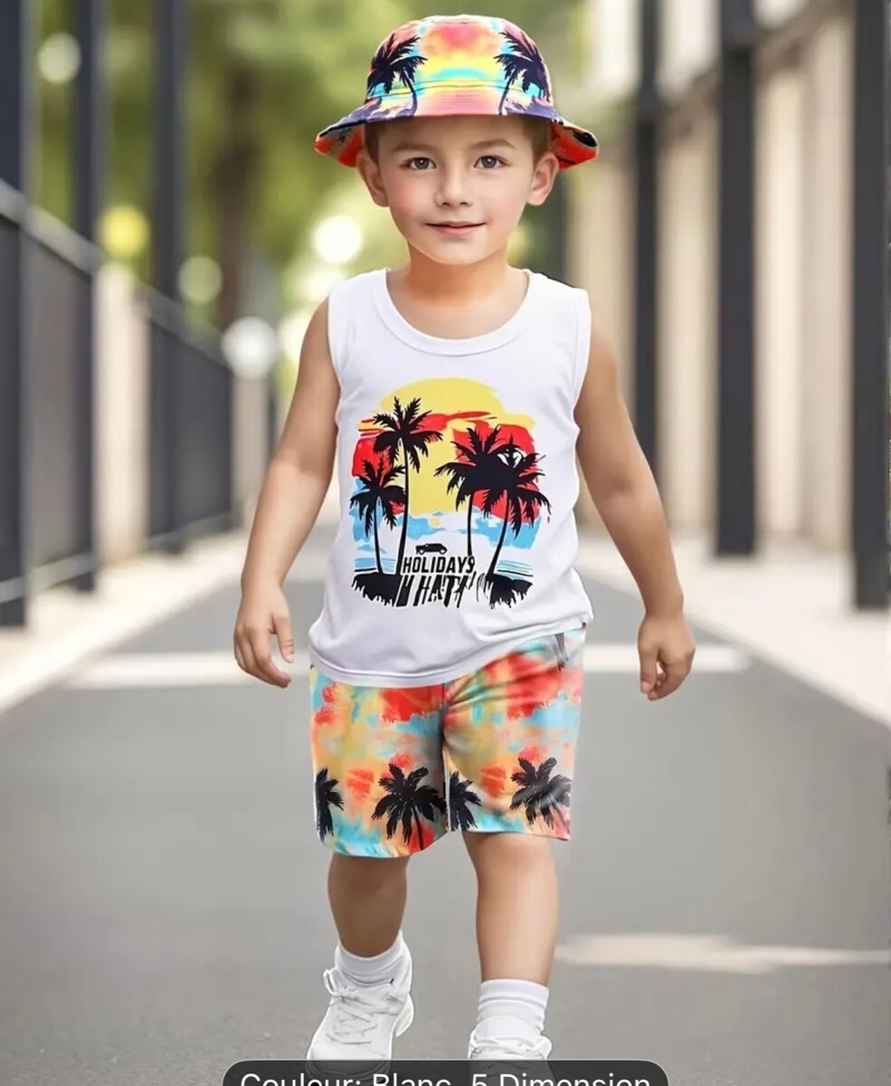 Cet ensemble estival pour enfant est parfait pour les vacances. Composé d'un débardeur et d'un short à motifs palmiers colorés, il offre confort et style. Idéal pour jouer en plein air ou les sorties à la plage. Offrez à votre enfant le look des vacances d'été!