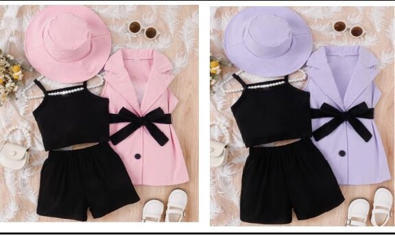 Adorable ensemble d'été pour fille comprenant un haut en perles, un short élégant et une veste légère. Disponible en rose et violet, parfait pour les occasions spéciales et les journées ensoleillées. Complétez le look avec un chapeau assorti pour une allure sophistiquée.