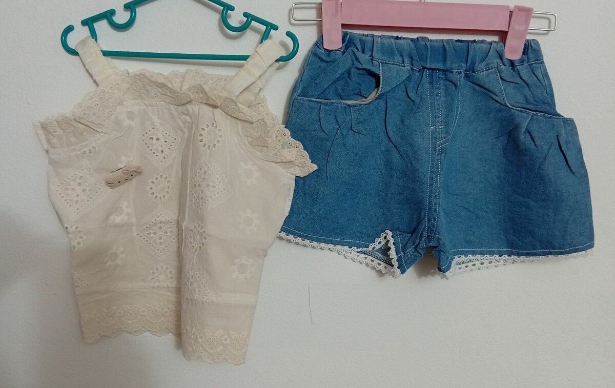 Ensemble charmant pour fille composé d'un haut à dentelle élégant et d'un short en denim confortable. Idéal pour les journées estivales, offrant style et confort. 2 et 5 ans