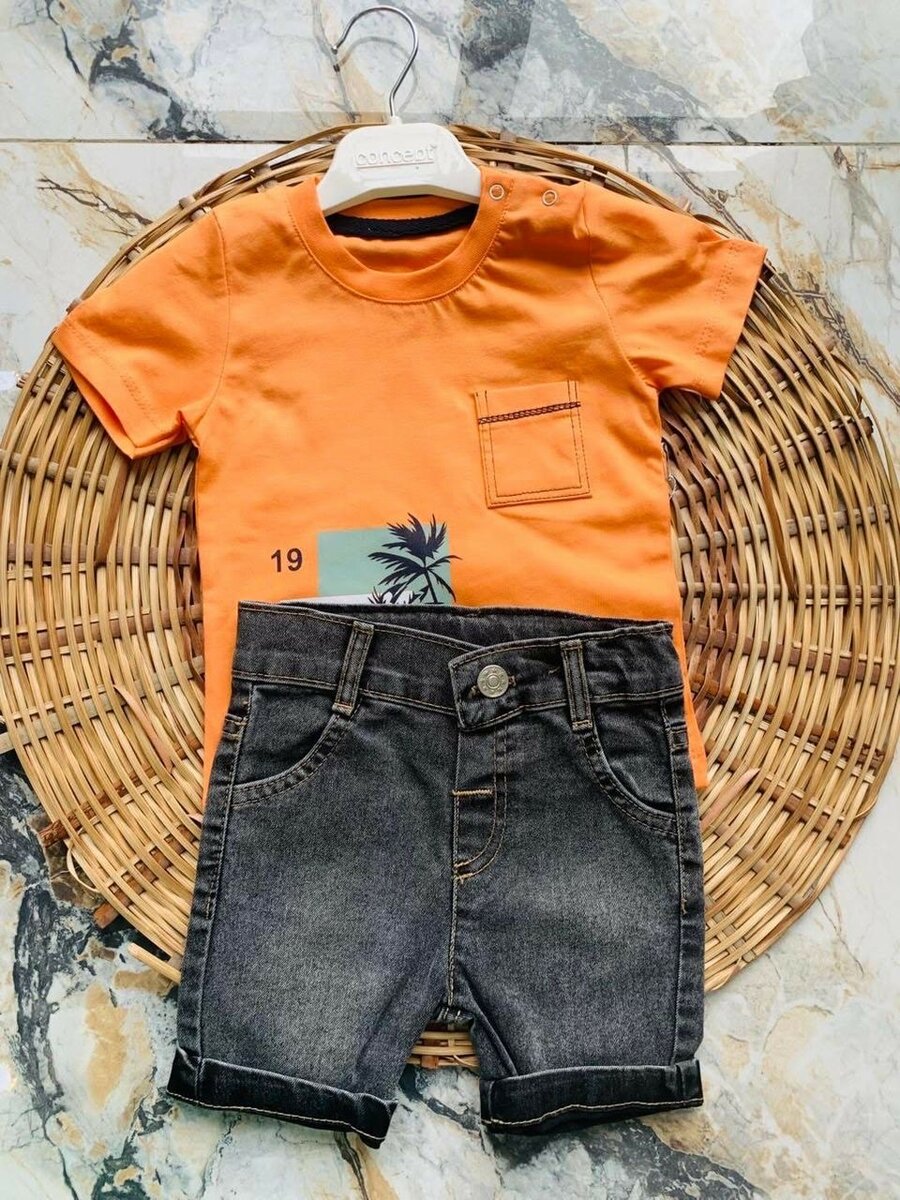 Cet ensemble tendance pour garçons comprend un t-shirt orange éclatant décoré d'un imprimé palmier et des boutons-pression pratiques à l'épaule, associé à un short denim confortable. Idéal pour les aventures estivales et les journées décontractées. Disponible en plusieurs tailles.