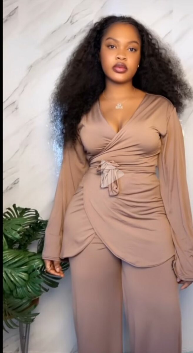 Ensemble femme élégant, disponible en vert et marron. Conçu pour les femmes modernes, cet ensemble est parfait pour des occasions spéciales ou pour une soirée chic.