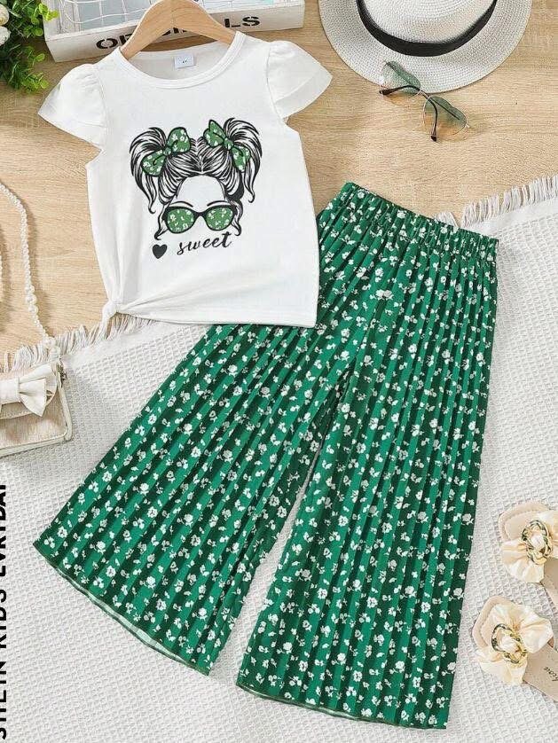 Ensemble tendance pour filles 4,5,6 ans avec t-shirt mignon et pantalon à motifs floraux. Confortable et idéal pour un look estival décontracté. Parfait pour les sorties et les jeux.