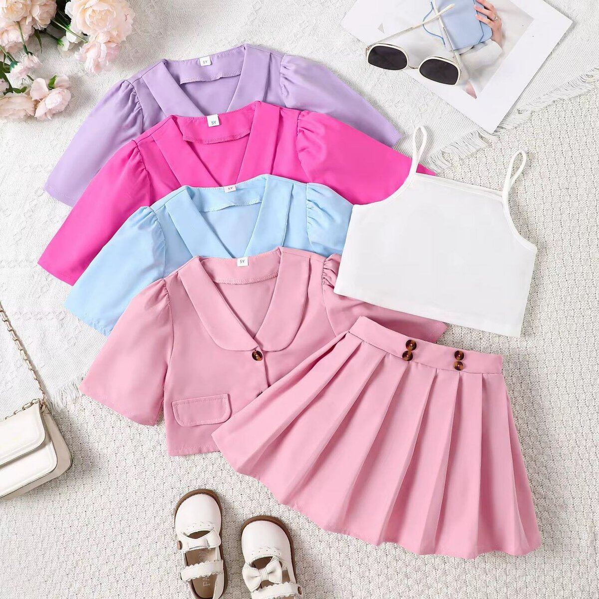 Adoptez un style chic pour votre petite avec cet ensemble 3 pièces. Veste à boutons, jupe plissée élégante et débardeur confortable. Disponible en plusieurs couleurs joyeuses. Idéal pour des occasions spéciales et des sorties.