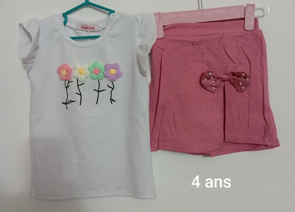 Charmant ensemble pour fille de 4 ans, comprenant un t-shirt blanc décoré de fleurs colorées en relief et un short rose avec nœud. Idéal pour le quotidien ou les sorties, offrant confort et style avec une touche ludique.
