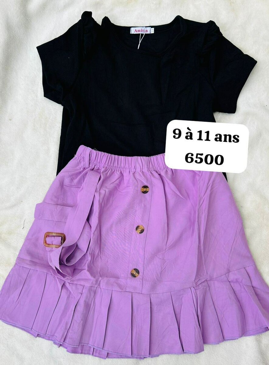 Élégant ensemble pour filles de 9 à 11 ans, composé d'un joli haut noir et d'une jupe violette avec boutons décoratifs. Parfait pour des occasions spéciales ou des sorties décontractées. Confortable et à la mode.