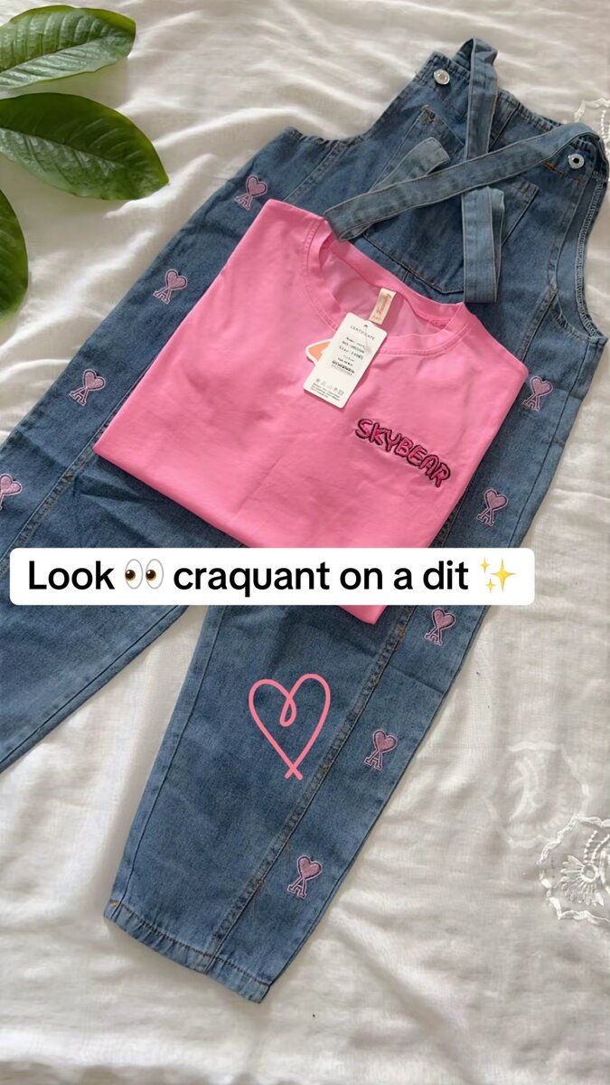 Cet ensemble mignon pour filles de 6 / 7 ans comprend une salopette en denim ornée de petits motifs et un t-shirt rose vif et blanc. Idéal pour un look décontracté et tendance, parfait pour jouer ou sortir avec style. Confortable et facile à porter, c'est le choix parfait pour les petites exploratrices.