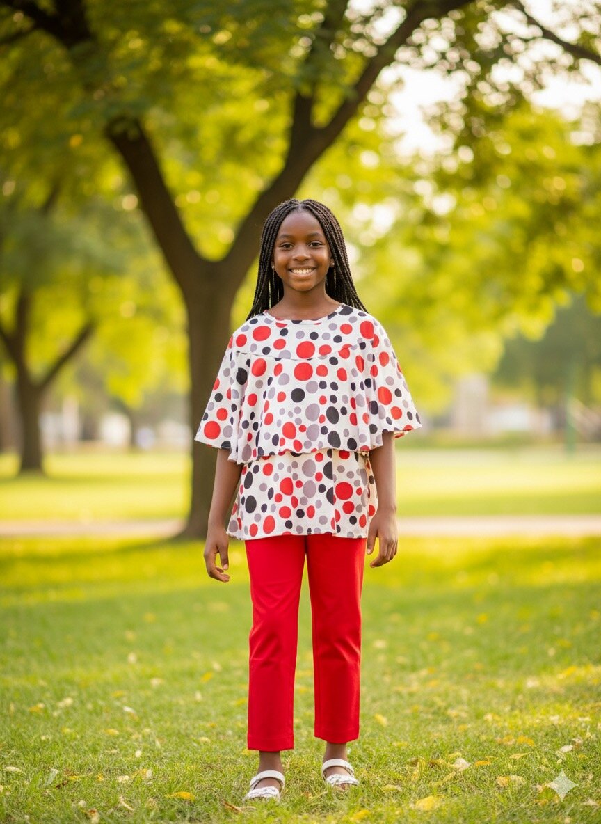 Ensemble coloré pour filles, idéal pour toutes occasions. Ce set comprend un haut à pois et un pantalon rouge, apportant confort et style. Parfait pour les journées ensoleillées ou les événements spéciaux. Disponible dans plusieurs tailles.