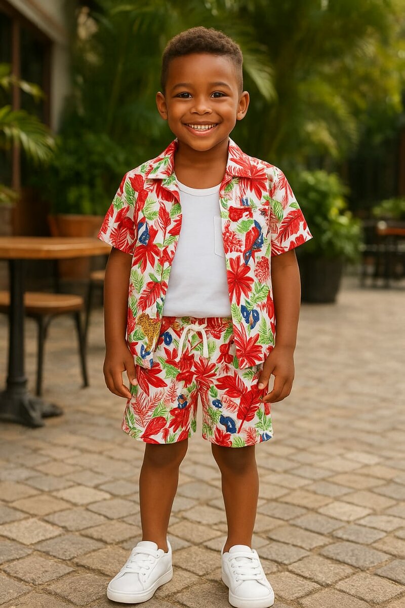 Cet ensemble tropical est parfait pour les garçons dynamiques et stylés. Avec des imprimés colorés et une matière légère, c'est idéal pour l'été ! Parfait pour les sorties décontractées ou les vacances.