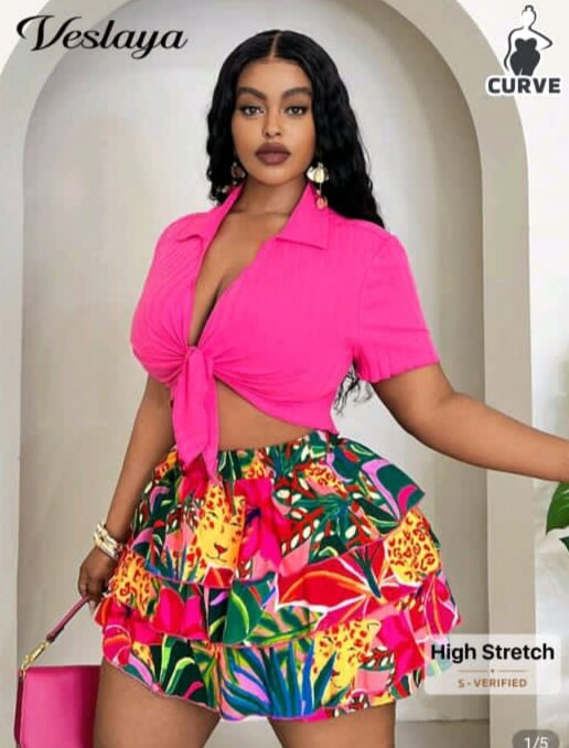 Éblouissez avec cet ensemble vibrant et stylé. Haut noué rose et jupe à imprimé tropical, conçu pour les femmes modernes. Tissu extensible pour un confort optimal lors des journées chaudes ou sorties estivales.