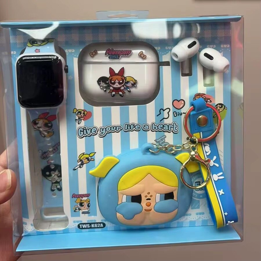 Ensemble cadeau amusant avec montre, écouteurs et housses dessin animé. Parfait pour les fans de style ludique et coloré.