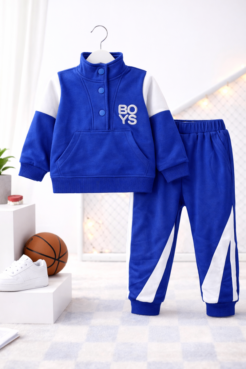 Ensemble de survêtement bleu pour garçons, idéal pour le sport et les sorties. Design moderne avec motifs blancs. Confortable et stylé, parfait pour les activités quotidiennes.