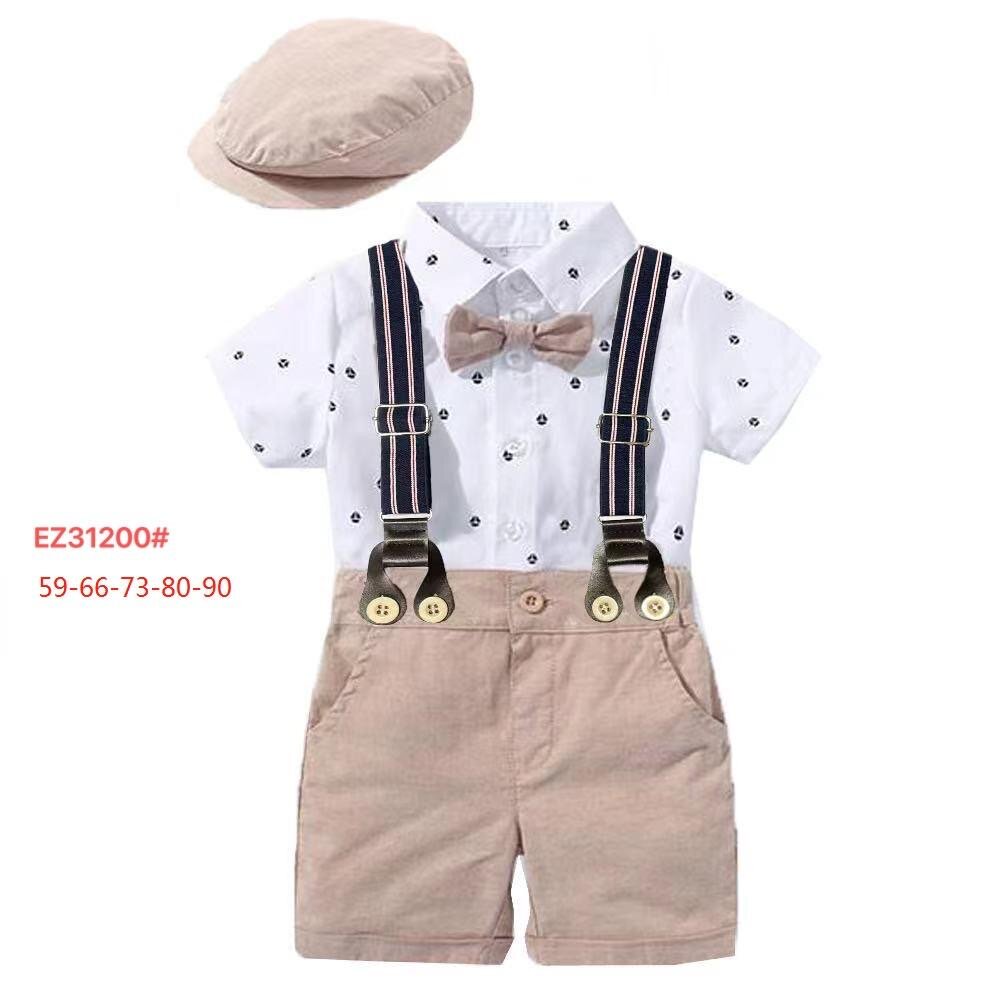 Optez pour cet ensemble chic pour garçon, parfait pour des occasions spéciales. Composé d'une chemise à motif, d'un short à bretelles et d'un chapeau assorti, il offre un look charmant et sophistiqué. Idéal pour des cérémonies ou des sorties élégantes !
