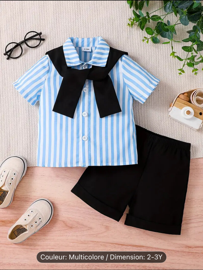 Découvrez cet ensemble chic pour garçons de 2 à 3 ans, comprenant une chemise rayée bleue et blanche avec un col original, associé à un short noir confortable. Parfait pour des occasions spéciales ou des sorties estivales, cet ensemble propose un look élégant tout en restant pratique pour les petits aventuriers. Fait avec des matériaux doux et respirants, il assure le confort tout au long de la journée. Faites de votre enfant la star de chaque événement !
