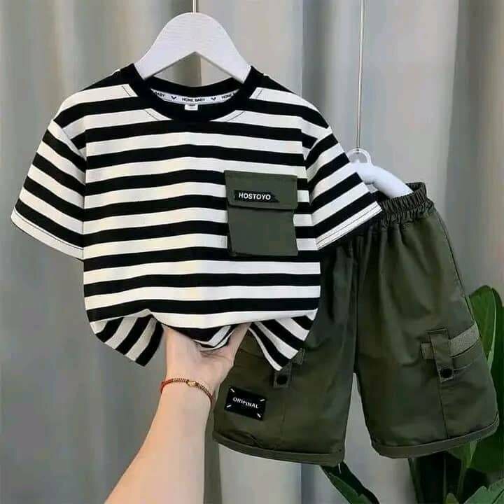 Tenue confortable pour garçon comprenant un T-shirt rayé noir et blanc avec poche avant et un short cargo vert olive avec poches latérales. Idéal pour les activités quotidiennes et les sorties.