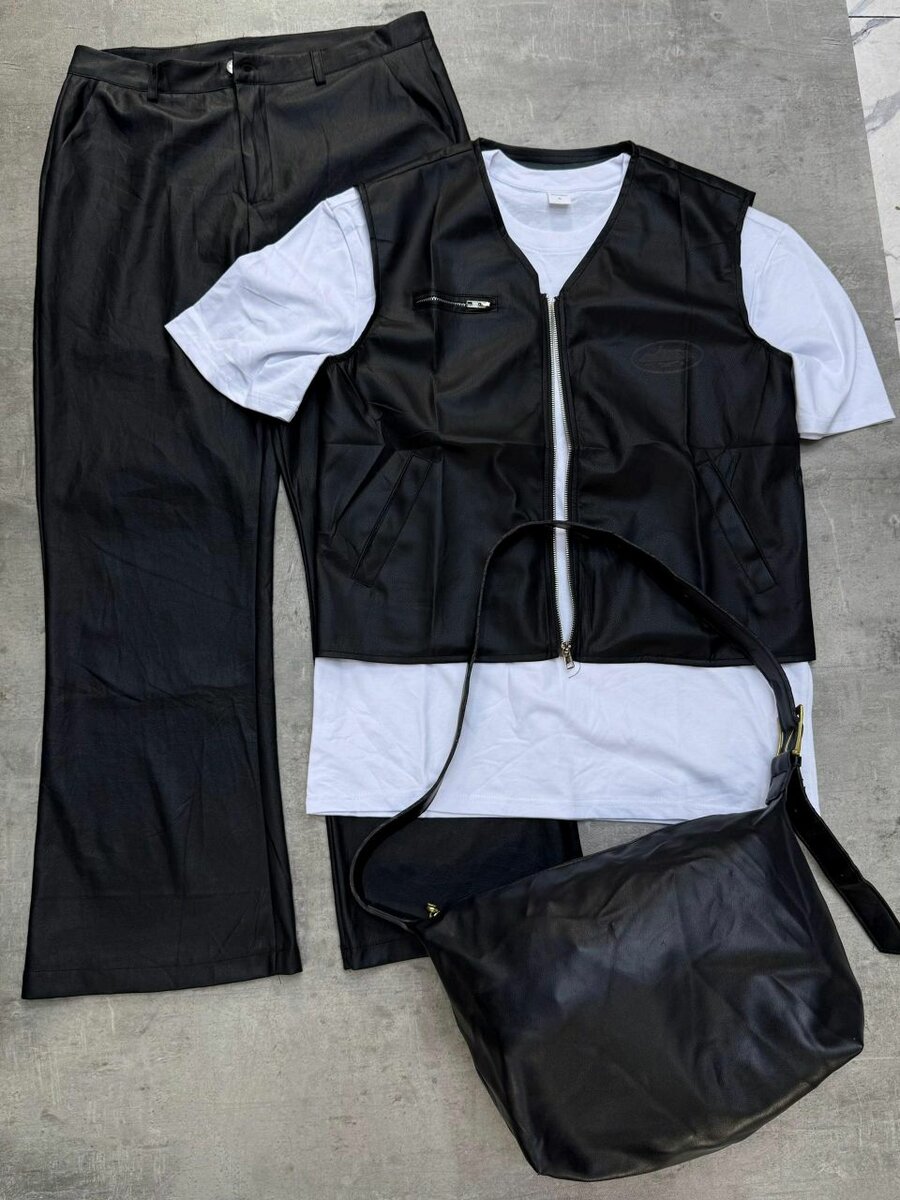 Découvrez cet ensemble élégant composé d'un gilet en cuir et d'un pantalon coordonné. Conçu pour un look moderne et tendance, il est parfait pour les occasions décontractées ou semi-formelles. Associez-le à un T-shirt blanc et à un sac en cuir métallisé pour un style unique.