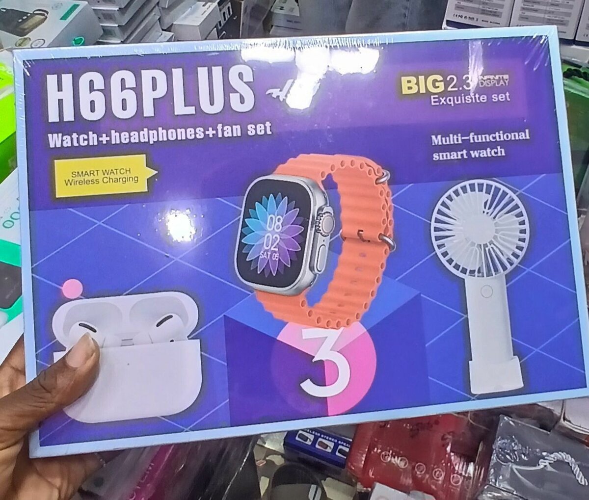 Découvrez le set H66Plus avec une montre intelligente multifonctionnelle, des écouteurs sans fil et un ventilateur portable. Idéal pour les passionnés de technologie à la recherche de praticité et de style.