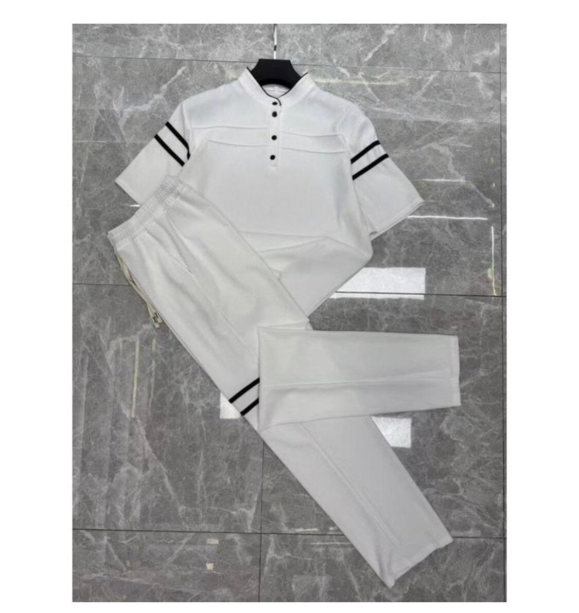 Ensemble homme élégant et moderne composé d'un polo et d'un pantalon blanc avec des bandes noires. Idéal pour un look sportif et chic.