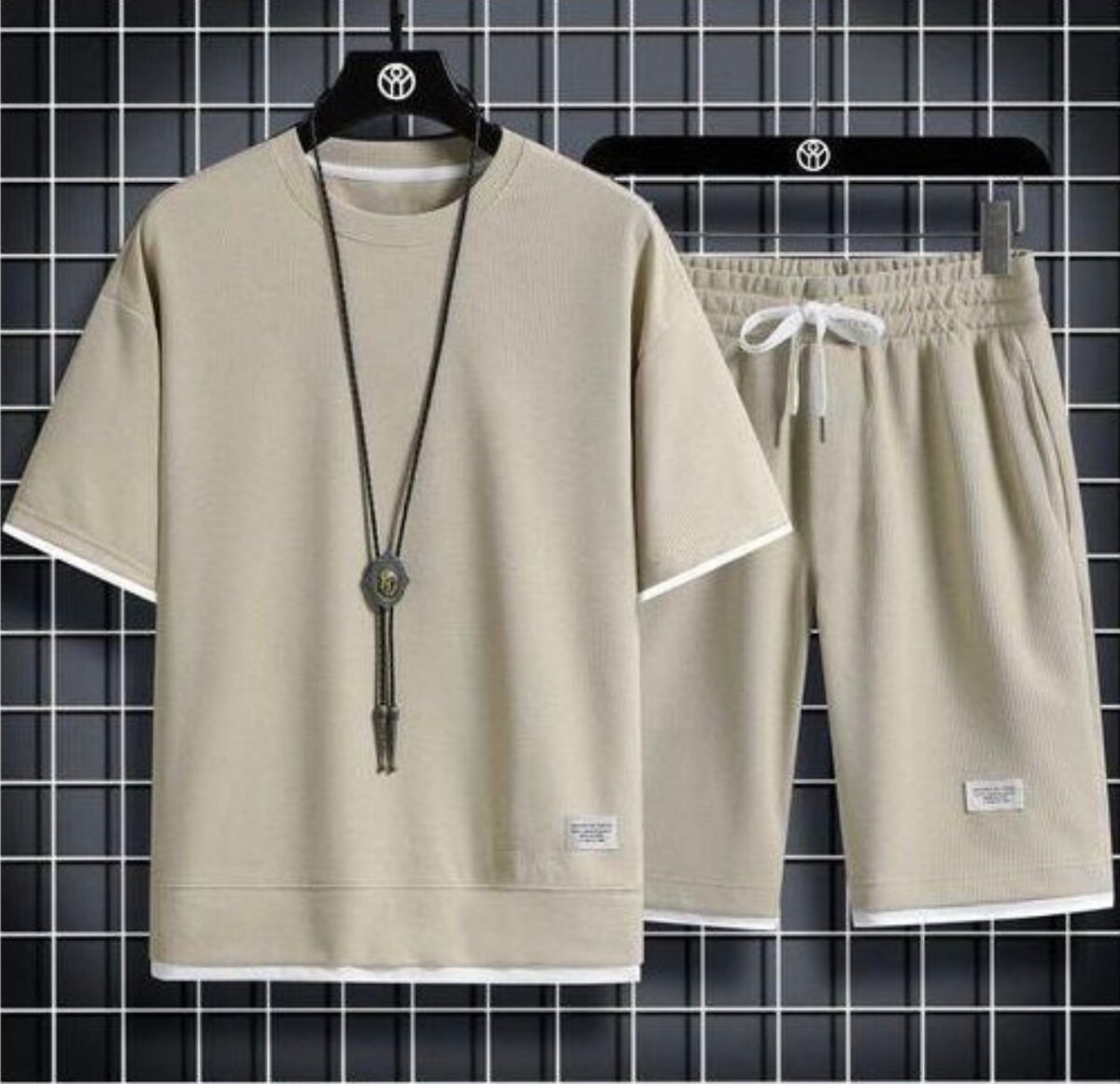 Ensemble homme été composé d'un T-shirt et d'un short beige. Confortable et élégant pour les journées d'été.