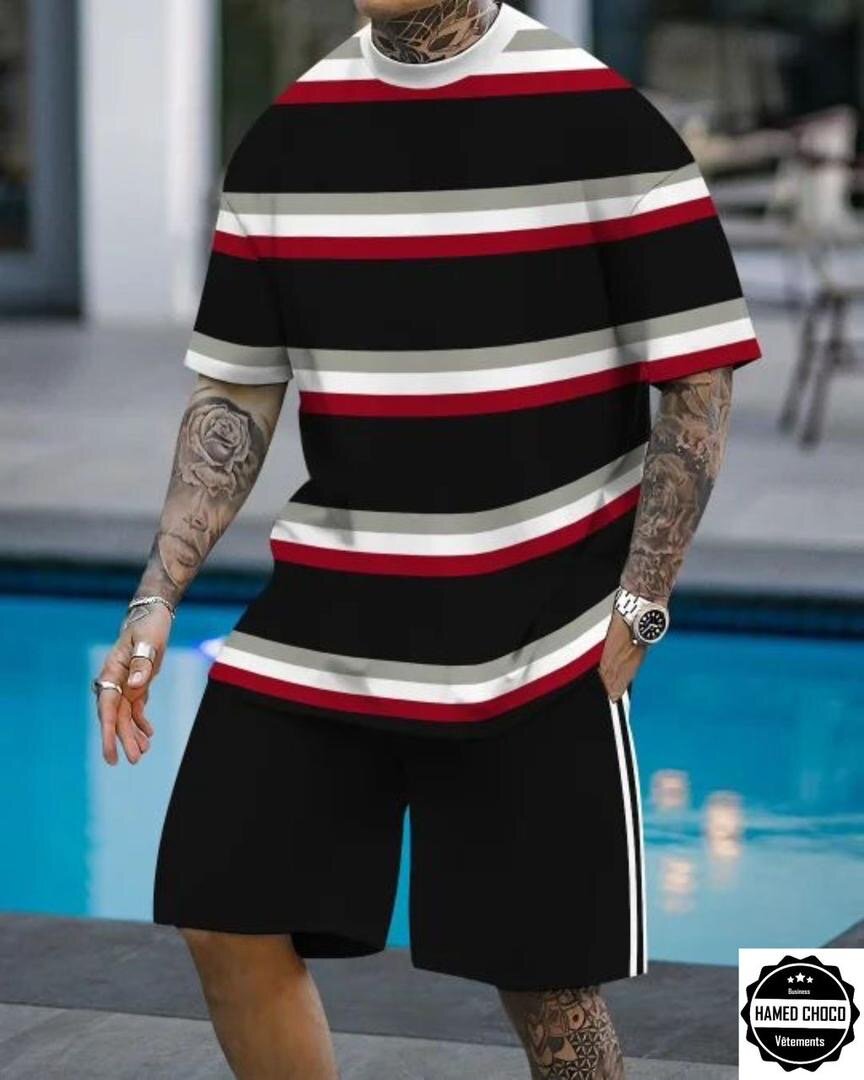 Ensemble pour homme comprenant un t-shirt et un short. Confortable et élégant, idéal pour les activités décontractées et les sorties en ville.