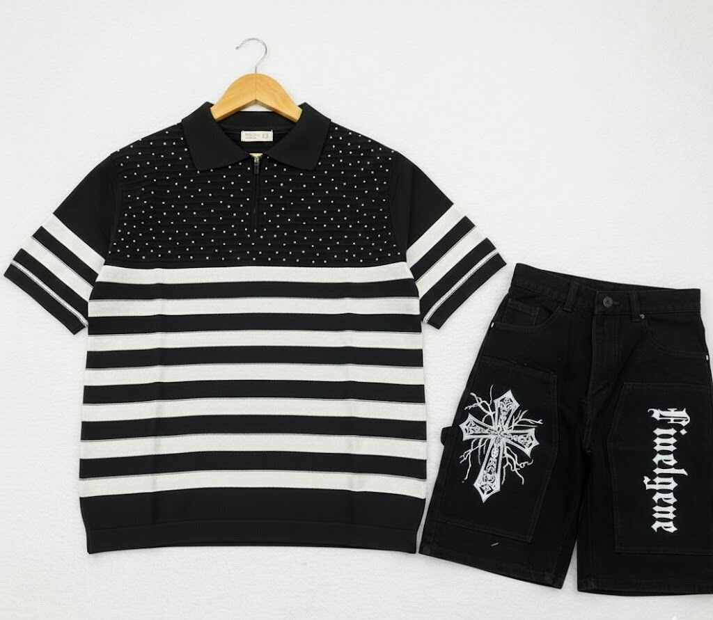 Polo rayé noir et blanc avec col et détails de points, assorti à des shorts noirs avec impressions originales. Idéal pour un look décontracté et stylé.
