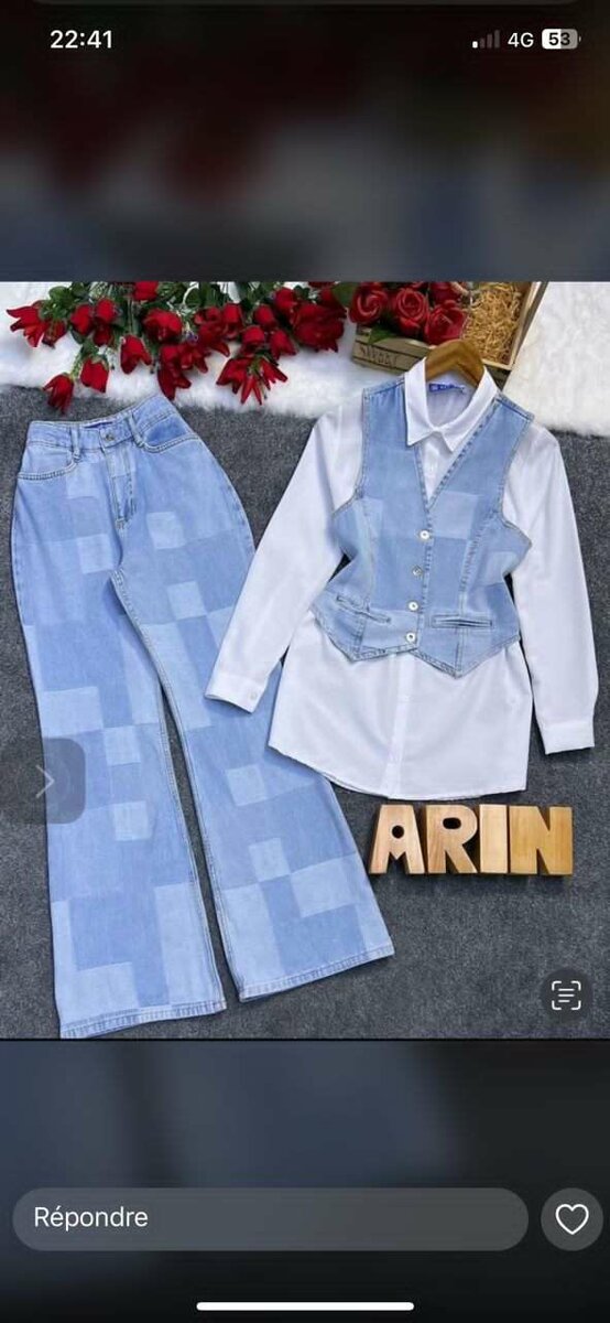 Découvrez cet ensemble jean ultra tendance composé d'une chemise blanche élégante et d'un gilet assorti, parfait pour un look casual chic. Inclus un pantalon en denim avec un motif unique pour un style audacieux. Idéal pour toutes les occasions décontractées ou professionnelles.