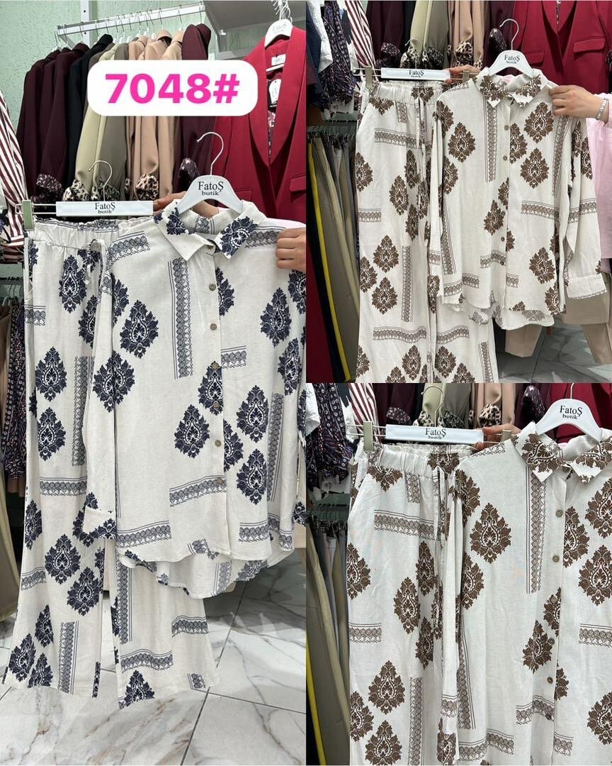 Ensemble élégant avec jupe longue et chemisier assorti, parfait pour les occasions spéciales. Tissu léger et motifs gracieux pour un style raffiné.