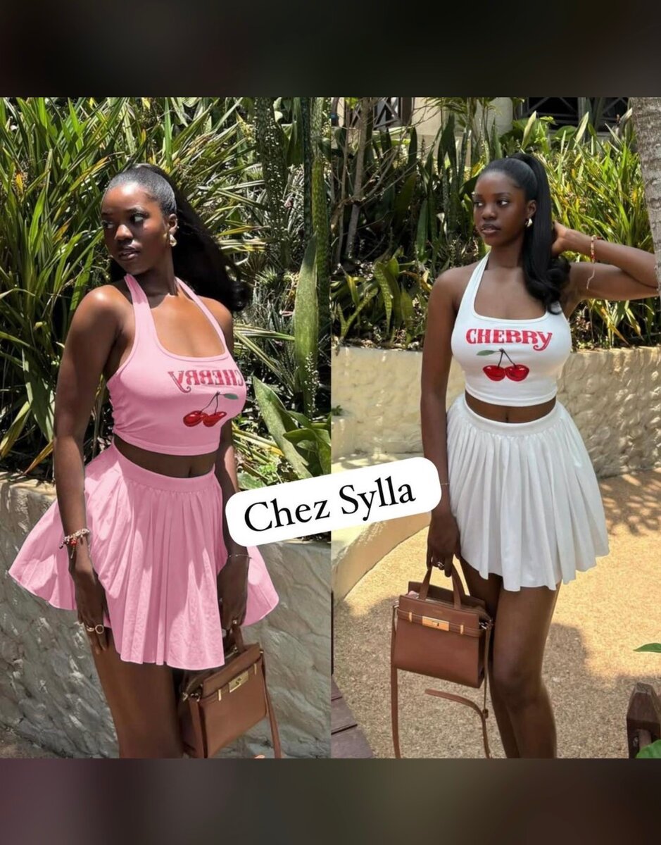 Adoptez un look estival frais avec cet ensemble jupe plissée et haut à motif cerise. Idéal pour les journées ensoleillées, ce set met en valeur votre style décontracté tout en restant élégant. Parfait pour les sorties entre amis ou une promenade en ville.