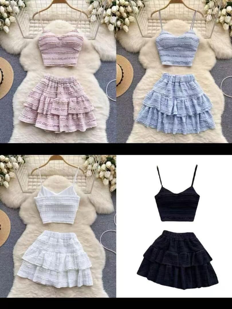 Cet ensemble élégant, composé d'une jupe et d'un haut volanté, est idéal pour les occasions décontractées. Offrant une coupe flatteuse et féminine, il est l'option parfaite pour l'été avec ses couleurs pastel et sa texture en dentelle douce. Polyvalent, il se marie facilement avec vos accessoires préférés pour créer des looks variés et tendance.